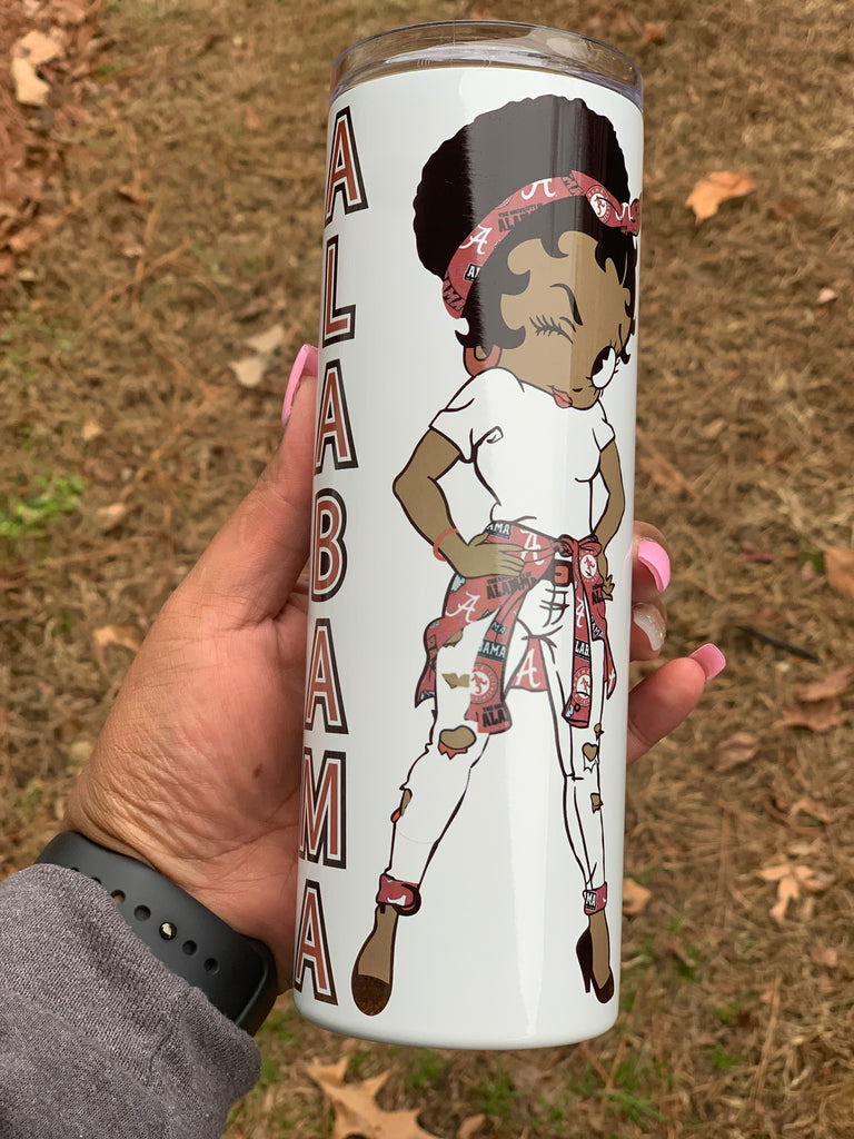 Experience the ultimate fan hype with our Alabama Roll Tide Betty Boop inspired tumbler! Made with durable stainless steel, this 20oz tumbler keeps your drinks at the perfect temperature while showing off your team pride. Perfect for game day or everyday use, this tumbler is a must-have for any Alabama fan. Roll Tide!
